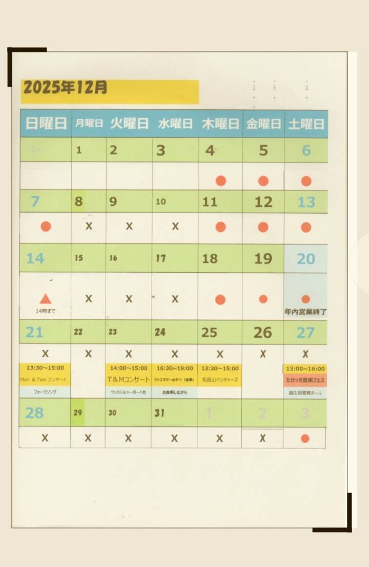 12月の予定です。今年の営業は12/20(土)で終わりとなります。次の週は、音楽のイベントが中心となります。よろしくお願いします。